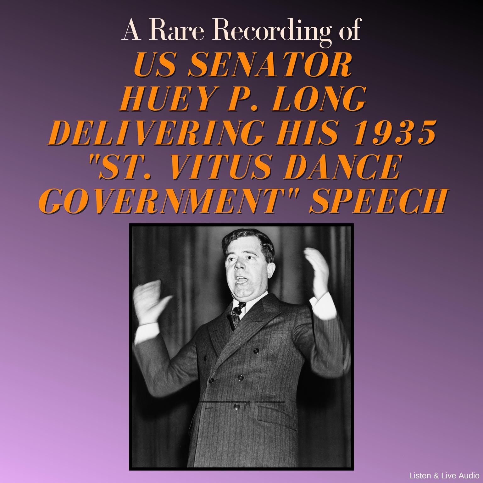 Huey Pierce Long Jr. (August 30, 1893 - September 10, 1935), nicknamed "The Kingfish", was an American politician who served as the 40th governor of Louisiana from 1928 to 1932 and as a United States senator from 1932 until his assassination in 1935. He was a left-wing populist member of the Democratic Party and rose to national prominence during the Great Depression for his vocal criticism of President Franklin D. Roosevelt and his New Deal, which Long deemed insufficiently radical. The following recording is of Long’s 1935 radio broadcast speech, The St. Vitus Dance Government.