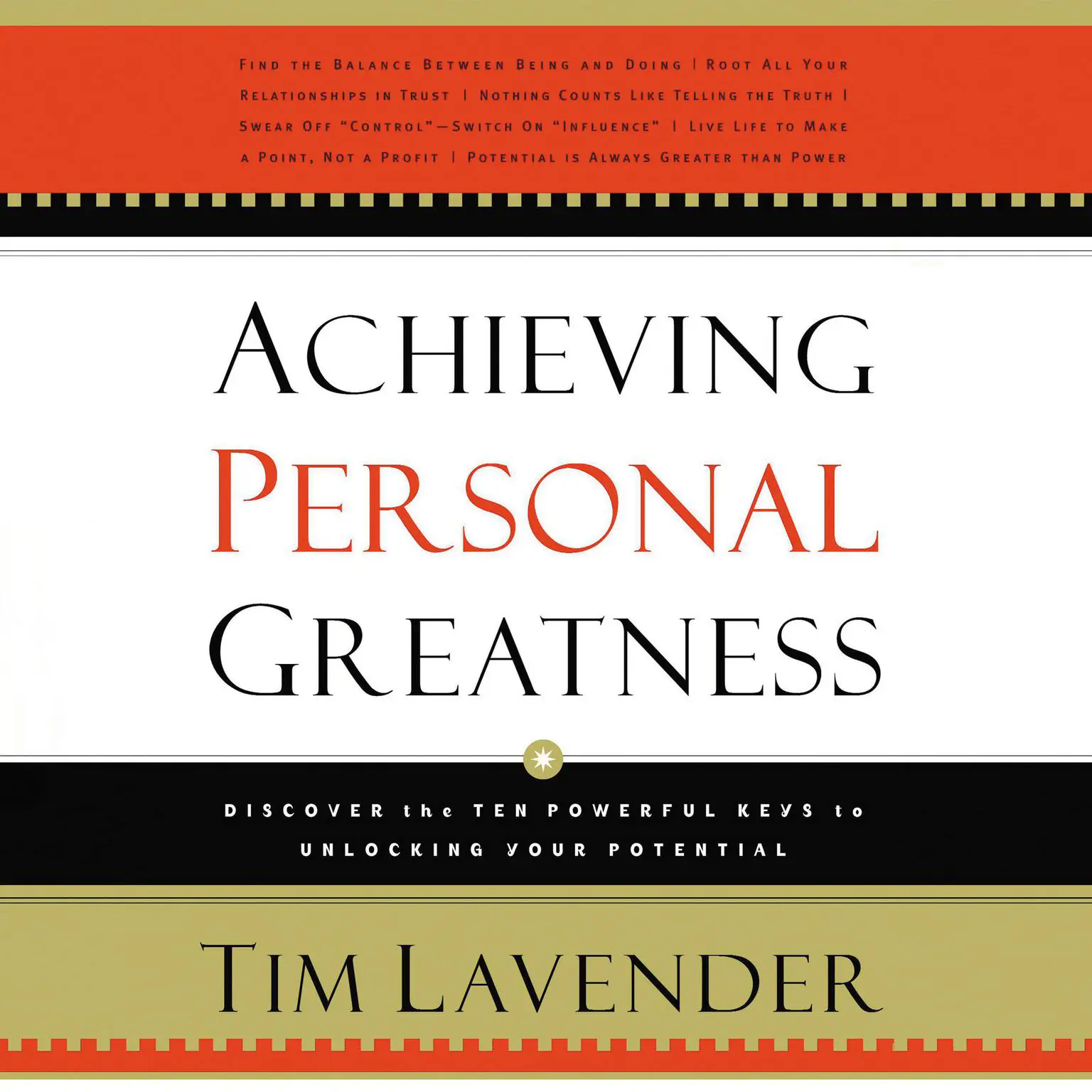 For years, a maxim of the United States Army was "Be all that you can be." While that familiar slogan may sound simple, there is great depth to the meaning behind it. in Achieving Personal Greatness, Tim Lavender offers his definition of "personal greatness" through three basic laws, and then shares the seven guiding principles for achieveing it. His practical guide explores ten powerful keys for releasing you potential, including: Get Your Cart Before the Horse, Reach Inside the Invisible World, Embrace a Lifetime of Learning,, and Seek to Influence Rather than Control. Finally, Lavender shares te five commitments that are necessary for producing results.