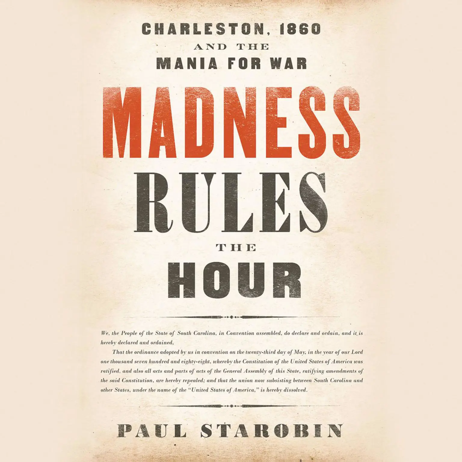 In Madness Rules the Hour, Paul Starobin tells the story of how Charleston succumbed to a fever for war and charts the contagion's relentless progress and bizarre turns. In doing so, he examines the wily propagandists, the ambitious politicians, the gentlemen merchants and their wives and daughters, the compliant pastors, and the white workingmen who waged a violent and exuberant revolution in the name of slavery and Southern independence. They devoured the Mercury, the incendiary newspaper run by a fanatical father and son; made holy the deceased John C. Calhoun; and adopted "Le Marseillaise" as a rebellious anthem. Madness Rules the Hour is a portrait of a culture in crisis and an insightful investigation into the folly that fractured the Union and started the Civil War.
