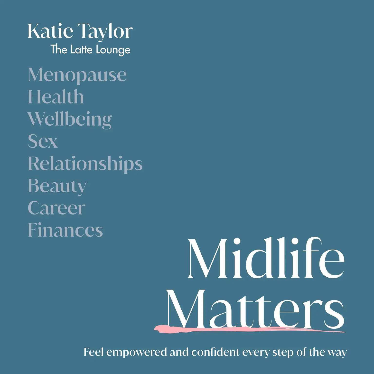 MIDLIFE MATTERS promises to be an all-encompassing guide and manual for midlife women, exploring the five key areas of HEALTH, WELLBEING, RELATIONSHIPS, WORK LIFE, CHALLENGES & OPPORTUNITIES with humor and honesty. Guiding us through, author Katie’s Taylor’s friendly narrative is supported by expert contributions in each chapter, including advice and resources from a world-renowned medical advisory team – and of course the testimonies of real women from the midlife community.